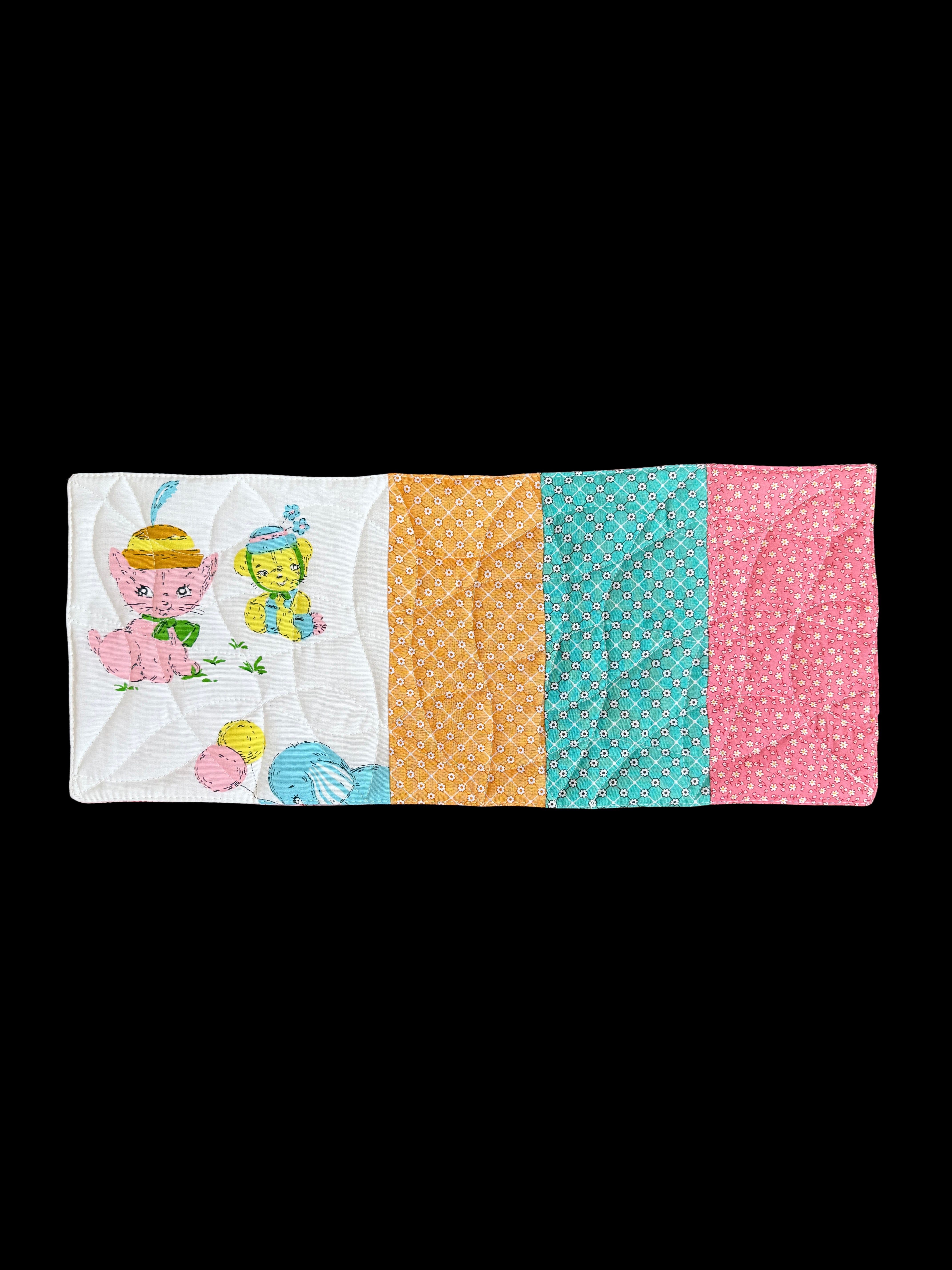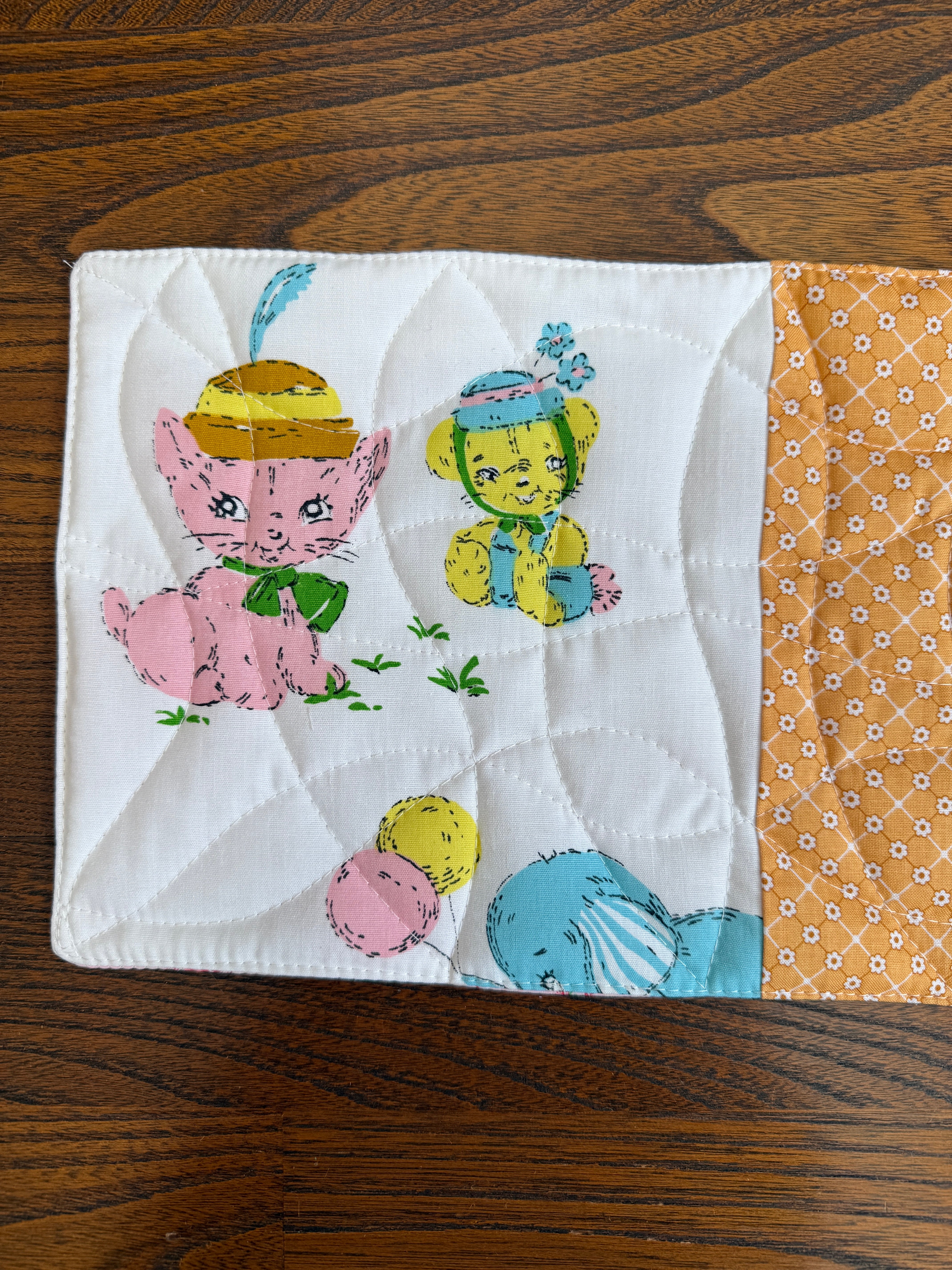 中綿を挟みキルティングステッチを施すことで丈夫に仕上がり汚れたらすぐに洗えるマットです